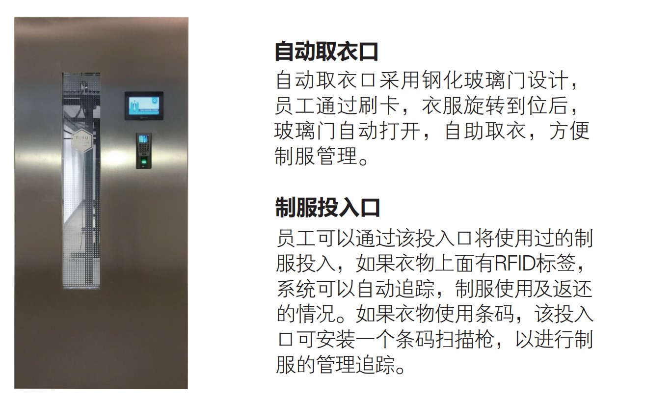 制服投入口 自動取衣口 方便進行員工的制服管理及洗衣門店的自助取衣,主要運用于 酒店,制藥廠,醫院。節省使用空間,員工刷卡,所需要的制 服自動轉出,快速便捷,節省人力。